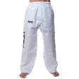Pantalon d'étudiant de Taekwon-Do de style ITF. Le pantalon est livré avec une taille élastique. Ce modèle comprend un patch Top Ten brodé et un caligrapfy de taekwondo brodé sur les côtés.
